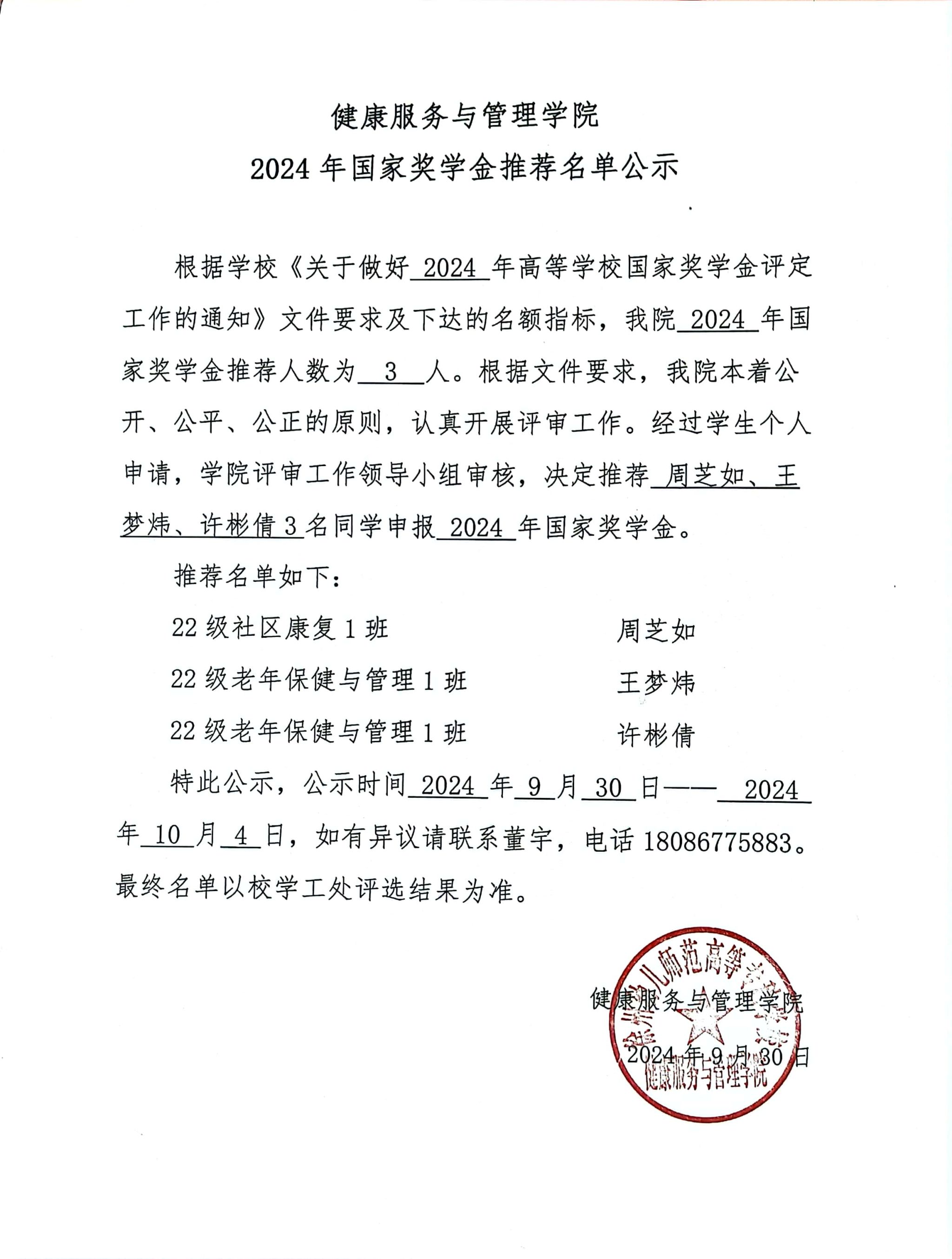 K1体育2024年国家奖学金推荐名单公示
