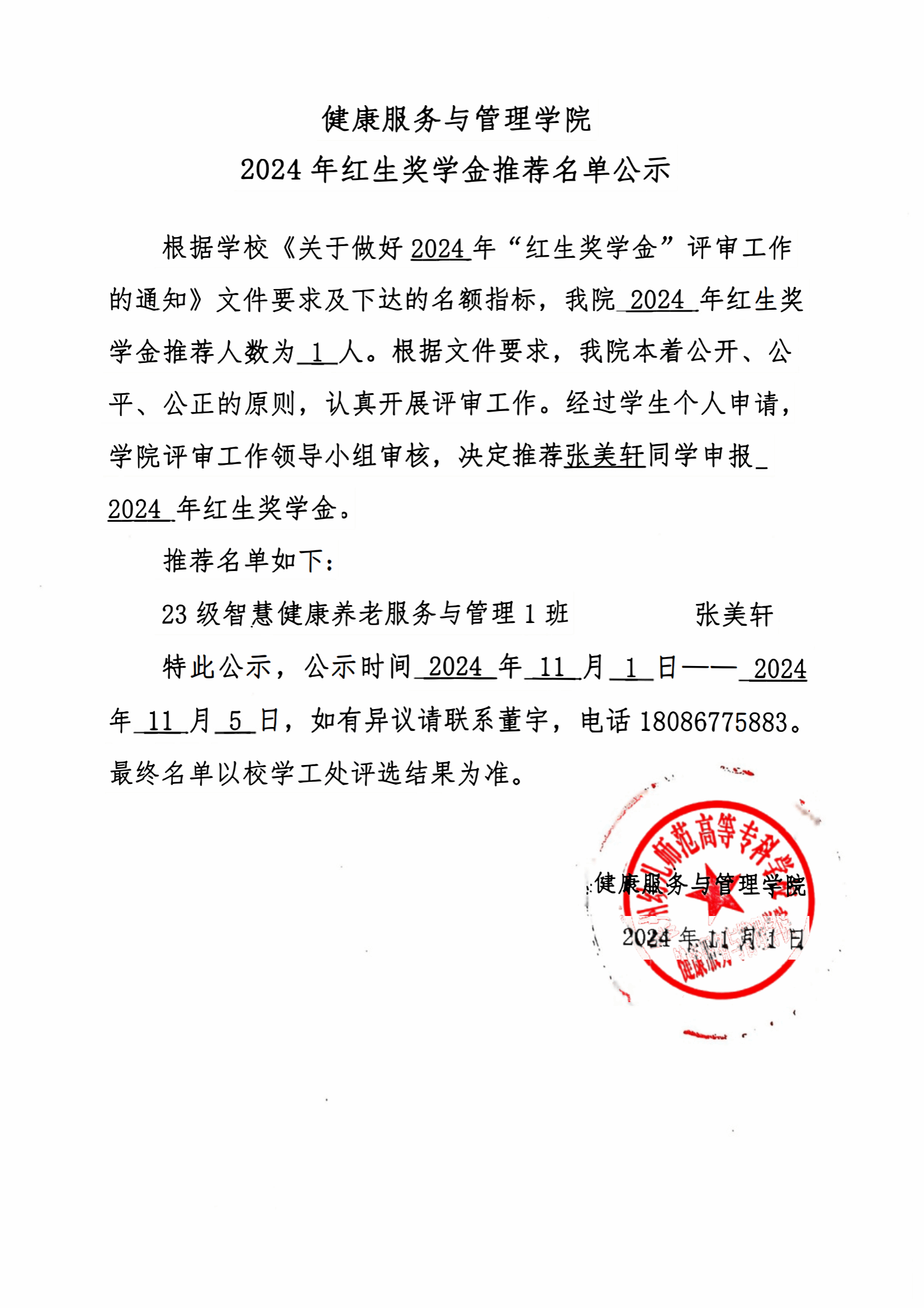 K1体育 2024年红生奖学金推荐名单公示
