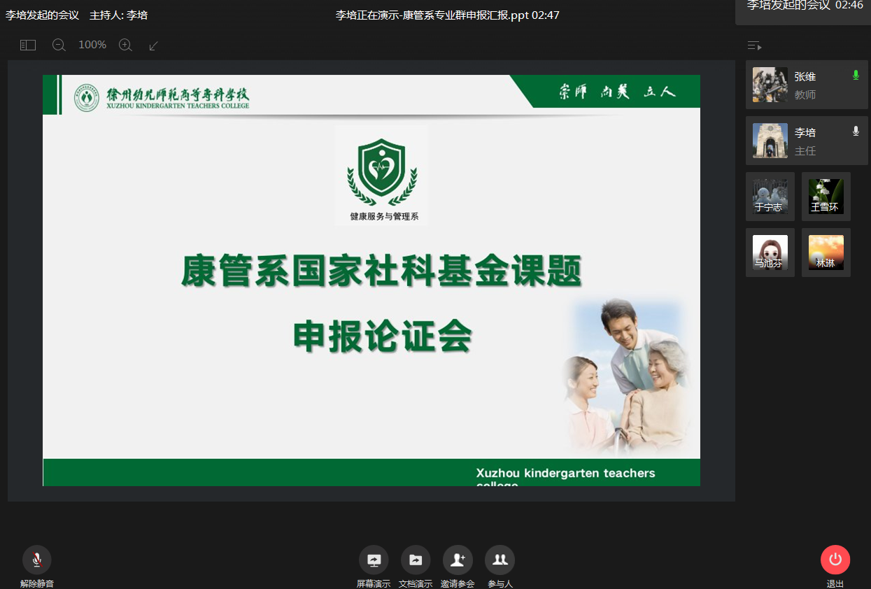 2020年4月9日,康管系组织召开国家社科基金课题申报论证会。会议由李培主任主持,课题申报评审组成员参加了会议。因疫情防控需要,申报论证会采取了网上会议的形式进行。