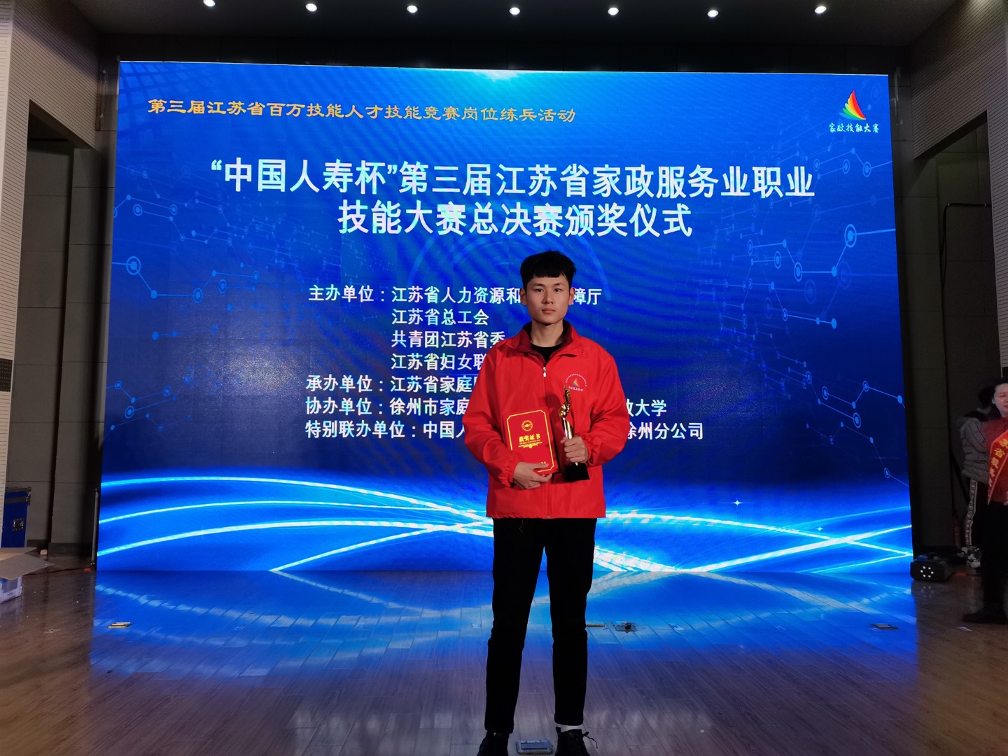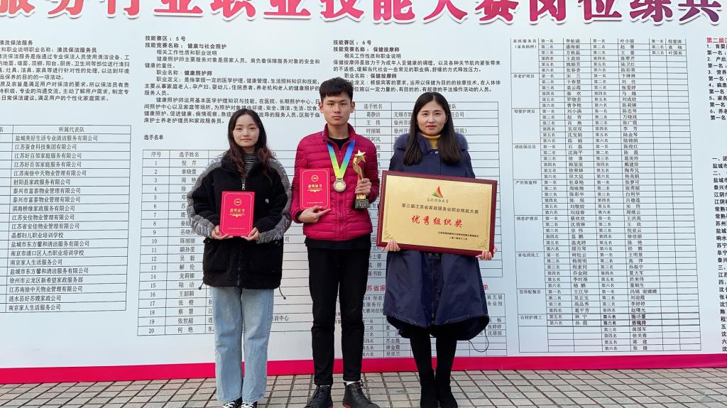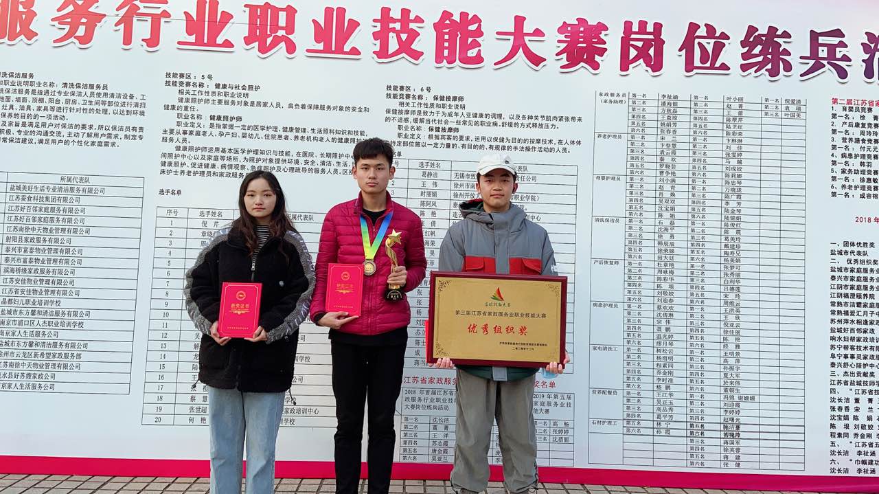 12月20日,江苏省第三届家政服务行业职业技能大赛岗位练兵活动决赛在徐州举行。本次大赛由省人社厅、省总工会、团省委、省妇联主办,全省各市59家单位的1700多名选手参赛。经过初赛筛选,共130名选手进入决赛,公司健康服务与管理系老年保健专业陈士豪、苏立帅入围保健按摩师赛项决赛,蒋青彦入围育婴员决赛。经过2天紧张的的理论与实操比赛,最终陈士豪同学在众多选手中脱颖而出,获得保健按摩师赛项第三名,公司荣获团体优胜奖和优秀组织奖。