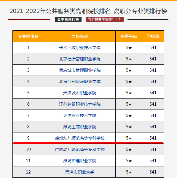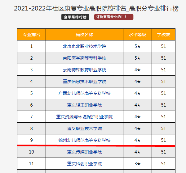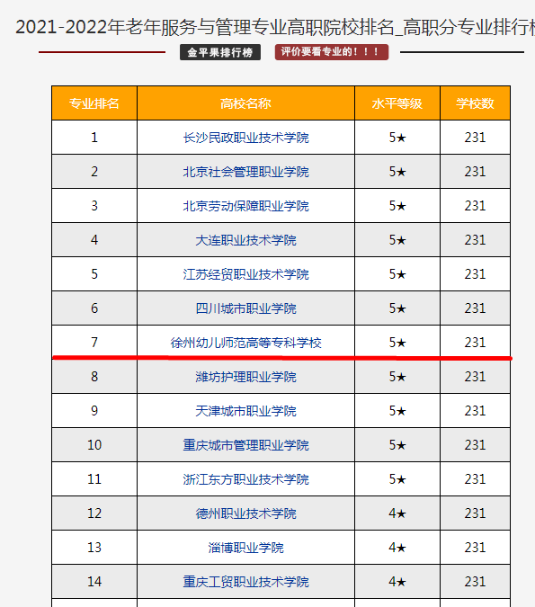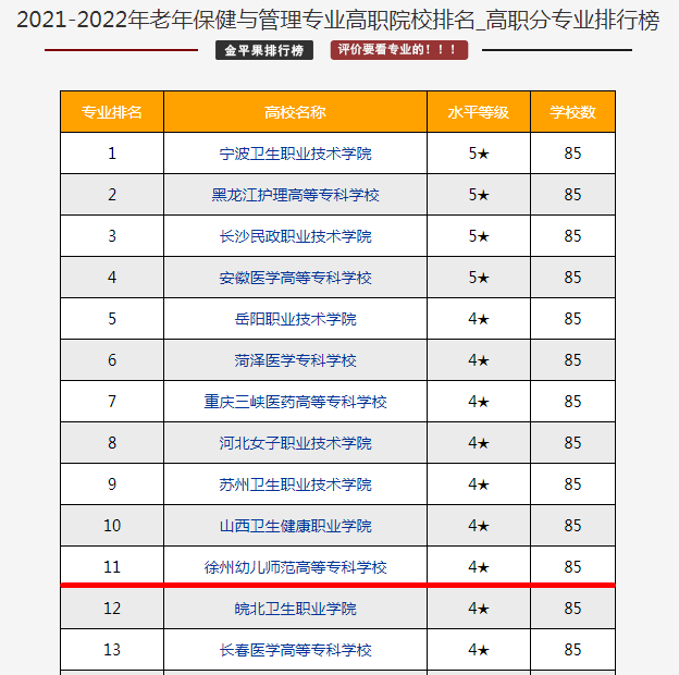 2021年4月29日,由杭州电子科技大学中国科教评价研究院、浙江高等教育研究院和高教强省发展战略与评价研究中心、武汉大学中国科学评价研究中心联合中国科教评价网研发的"金平果排行榜"第二次发布高职专业排行榜,我系老年服务与管理专业上榜2021中国高职院校分专业竞争力排行榜第七名,社区康复专业位列第九,老年保健与管理专业位列第十一,公共服务类专业综合排名全国第九。