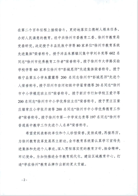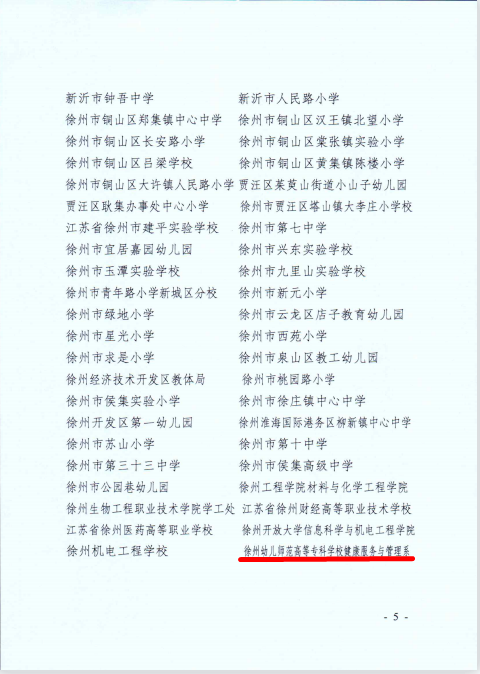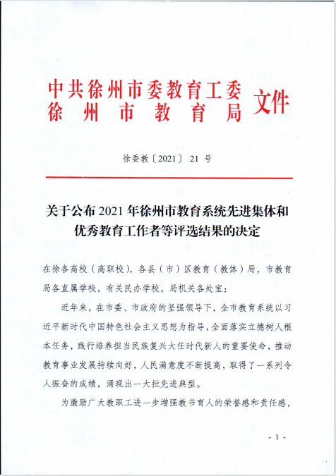近日,中共徐州市委教育工委、徐州市教育局联合发布《关于公布2021年徐州市教育系统先进集体和优秀教育工作者等评选结果的决定》,公司健康服务与管理系被评为徐州市教育系统先进集体。