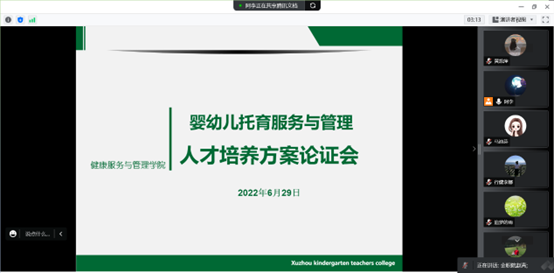 本次论证会以线上汇报和专家点评的方式进行。首先婴幼儿托育服务与管理专业负责人张海清老师汇报了专业人才培养方案中面向的产业、岗位、人才需求、专业人才培养规格、课程体系等方面的内容。论证会专家们认真听取了论证报告,围绕国家教育方针政策,对照高等职业公司产品标准,对课程体系的构建和改造提出了建设性与可行性意见,对培养方案的进一步修订完善起到了指导性作用。