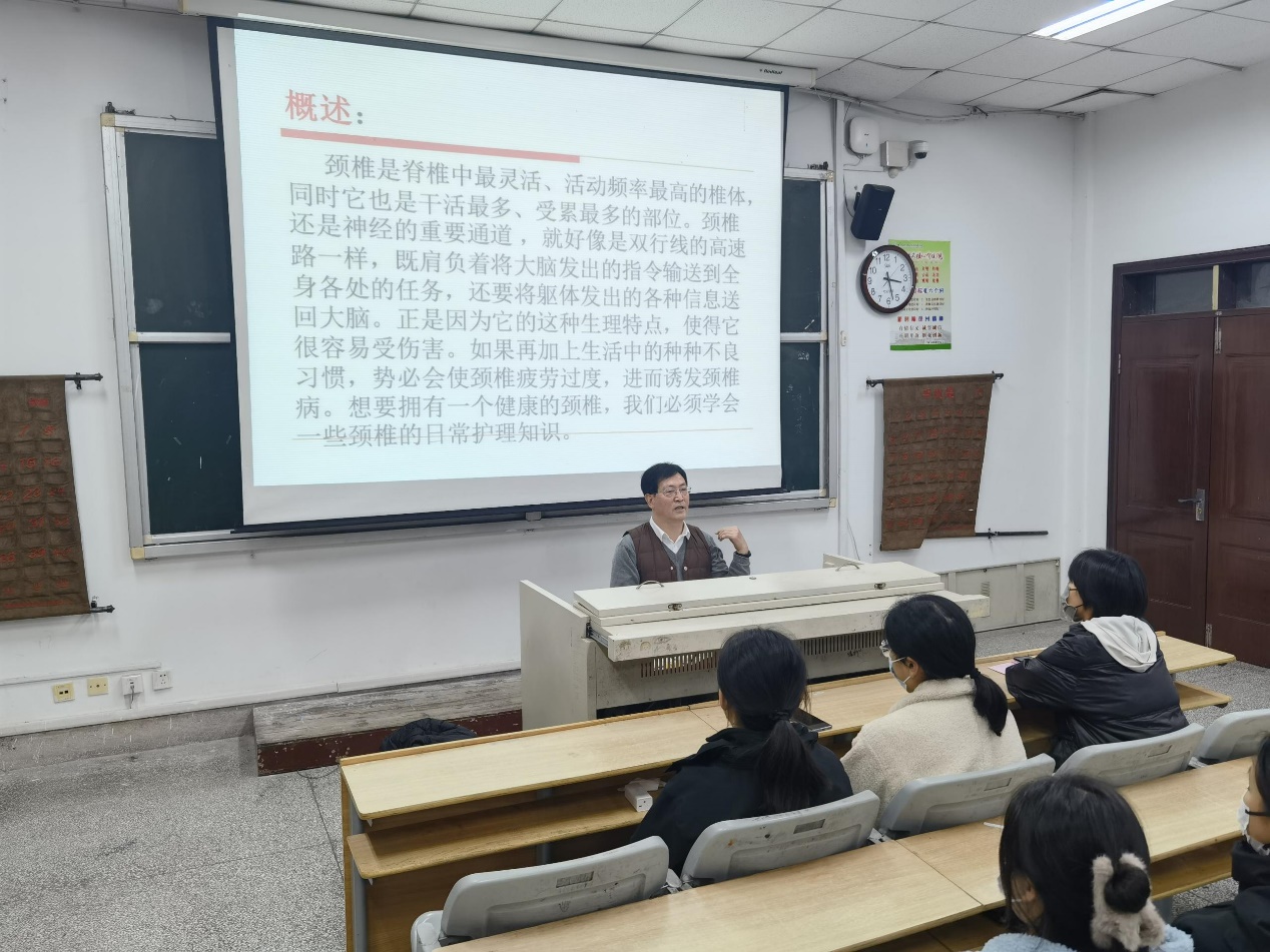 K1体育2022年“学术活动周”第二场讲座“颈椎病的预防与治疗”,于11月23日下午在洞山校区阶梯教室举办。活动特邀徐州中医院推拿科张运甡主任主讲,张维老师主持,K1体育部分师生参加了活动。