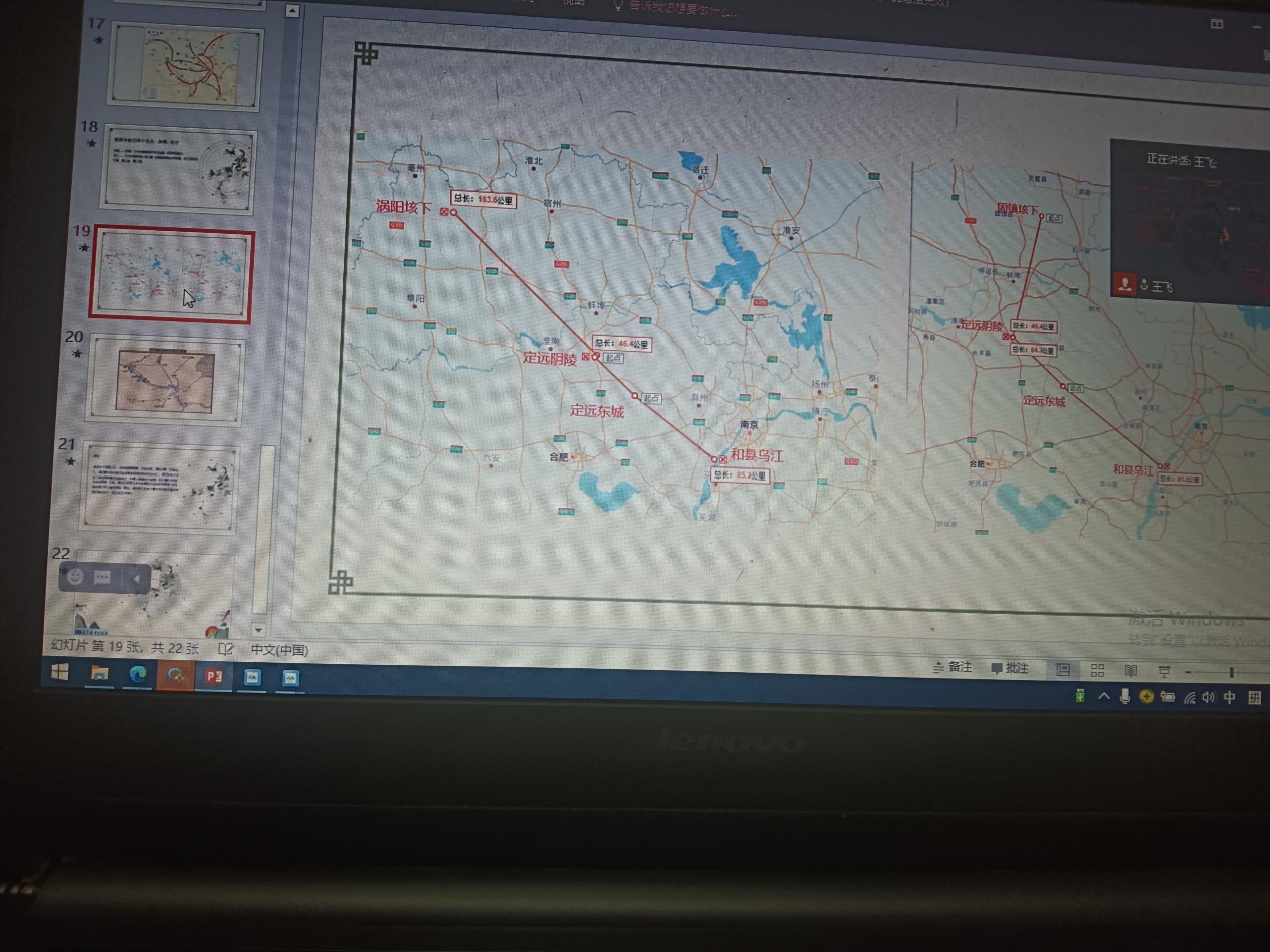 讲座还对《史记·项羽本纪》中的四个地名进行了考察,即垓下、阴陵、东城、乌江,藉此画出项羽溃围的基本路线,并与《史记》的记载相比照,指出项羽溃围的地理位置记载是较为严谨的,与今天的历史遗迹具有对应关系。另一方面,也对固镇的垓下、灵璧的垓下、涡阳垓下三地进行比较。主讲人王飞老师认为,项羽垓下溃围的战略意图十分明显:迅速突围,摆脱汉军,东渡乌江。项羽最大的可能是选择更加直接的路线到达乌江,涡阳的垓下正处于直线距离最短的路线上,如果从固镇垓下突围,则无需经过西南方向的阴陵、东城,更何况那里有英布的军队正赶来围堵,向西南突围无异于自投罗网。因此,项羽所在的垓下最大的可能是亳州市涡阳县的垓下,而不是另外两处。