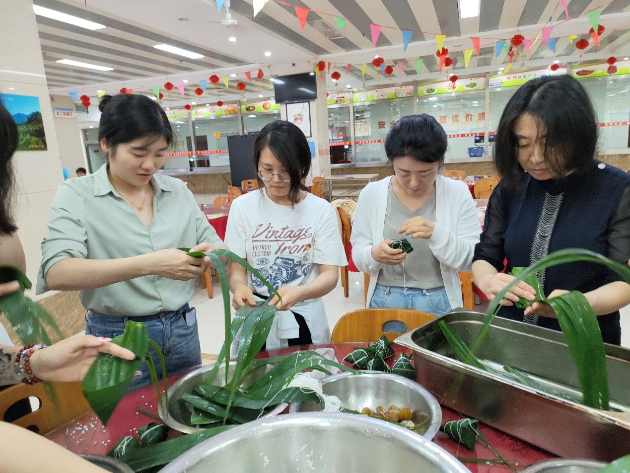 活动第一环节是包粽子。师生们热情高涨、积极参与,在食堂工作人员的示范下,边看边学、逐渐熟练。青青的粽叶包裹着珍珠似的糯米,再夹带着蜜枣,包好的粽子有三角的、有菱形的,各式各样,现场气氛融洽,大家感受到了劳动的喜悦和传统文化的乐趣。部分非党员教师也踊跃参与了包粽子活动。