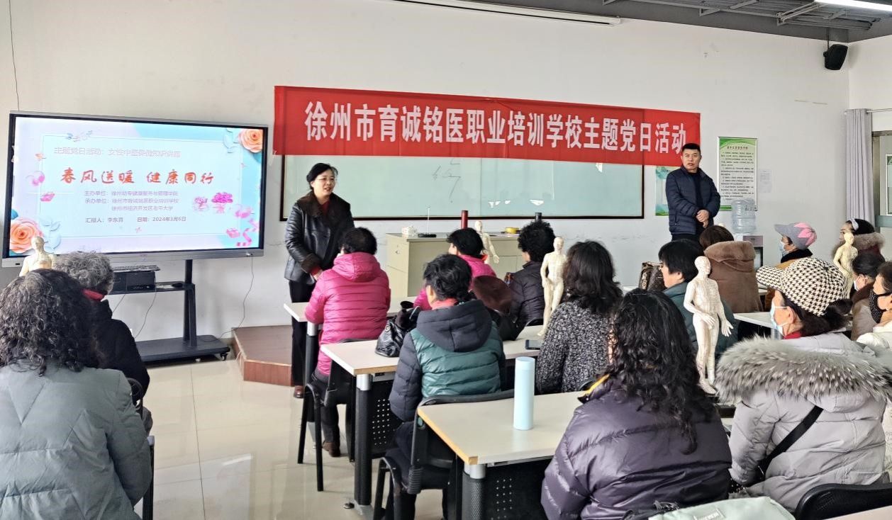 3月6日下午,康管公司与校企合作单位徐州市育诚铭医职业培训公司、经济开发区老年大学联合开展庆祝第114个国际妇女节暨“健康下基层”主题党日活动,举办“春风送暖 健康同行”女性中医保健知识讲座。康管公司党支部书记王保升、育诚铭医职业培训公司党支部书记李继玲、董事长苗雷、经济开发区老年大学董事长詹怀盈出席了活动。康管公司副经理王晓斐主持了活动。公司员工志愿者参加了活动。