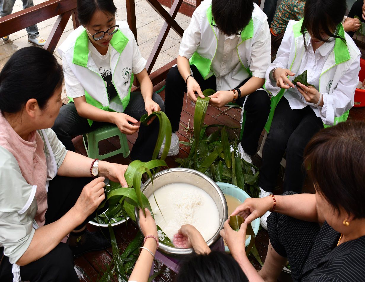 活动现场,志愿者们与社区老人们围在一起包粽子,裹粽叶、填糯米、装陷料、系绳子等步骤中流淌着温暖情谊。