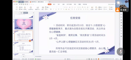 为深入贯彻省教育厅《关于在全省高校开展“向阳携行,共创未来—老员工心理健康教育江苏行”主题教育活动的通知》(苏教学函[2022]5号)精神,提升公司心理委员业务水平,激发员工向上向善、面向未来的奋斗力量,培育员工自尊自信、理性平和、积极向上的健康心态。3月25日晚,康管公司辅导员李艳萍召开了“向阳携行,共创未来”主题教育活动暨2021-2022年第二学期心理委员线上培训会。公司2020级、2021级心理委员及主要员工干部参加会议。