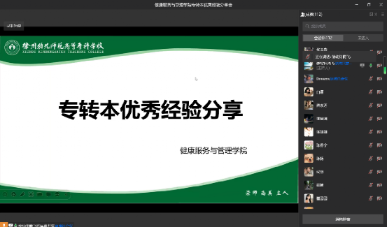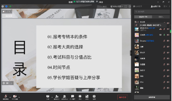 2023年1月11日下午,公司邀请了来自19级老年服务与管理班的胡文清、王青杨、顾淑雅三位2022年专转本成功上岸的优秀毕业生,在线举行了一场专转本优秀经验分享会。公司党总支副书记崔楠、辅导员许腾飞老师、董宇老师,公司已报名专升本考试的20级同学、有意向转本的21级和22级员工参加了本次分享会。会议由许腾飞主持。
