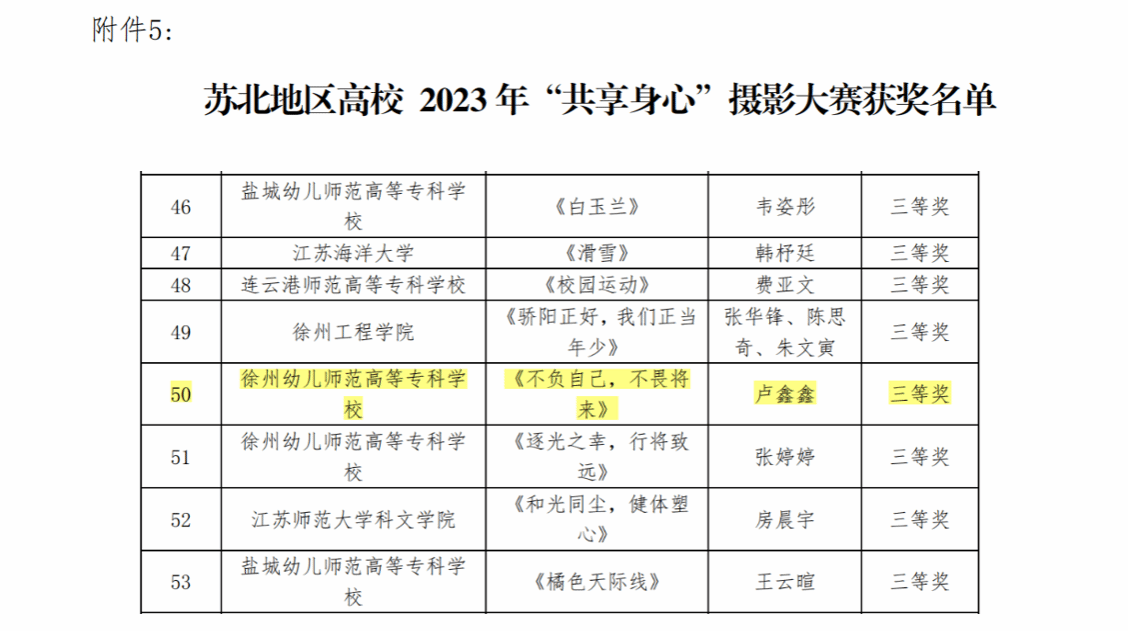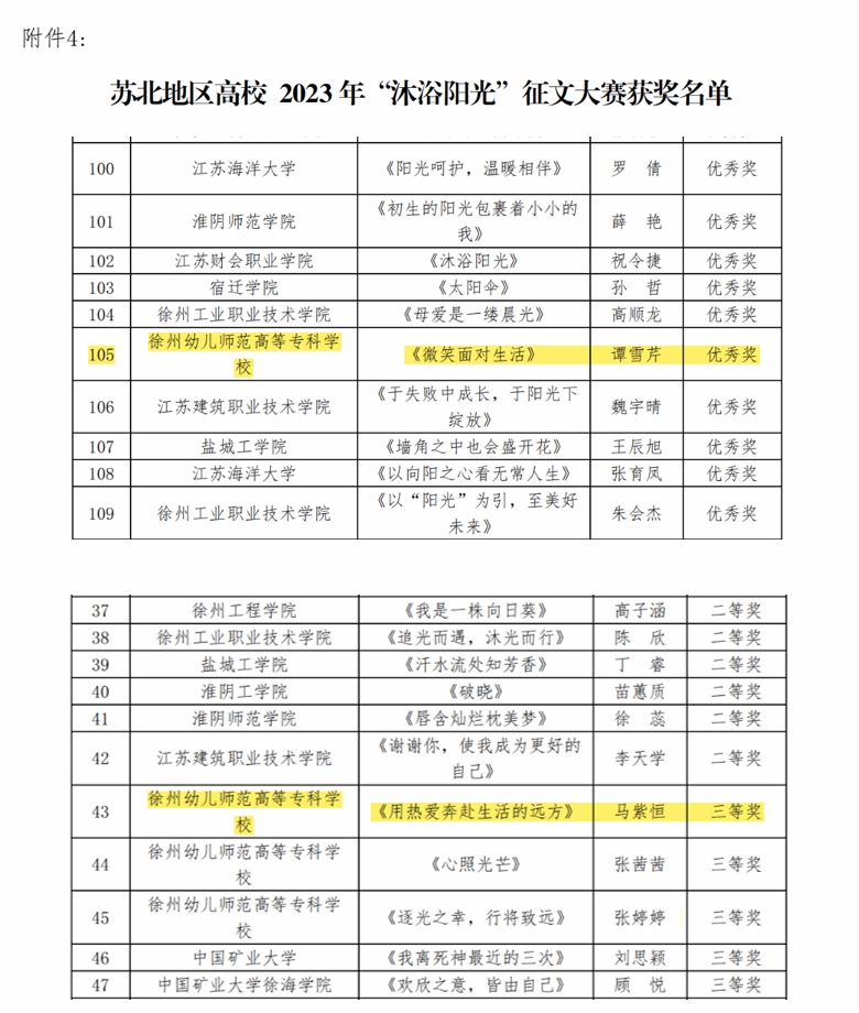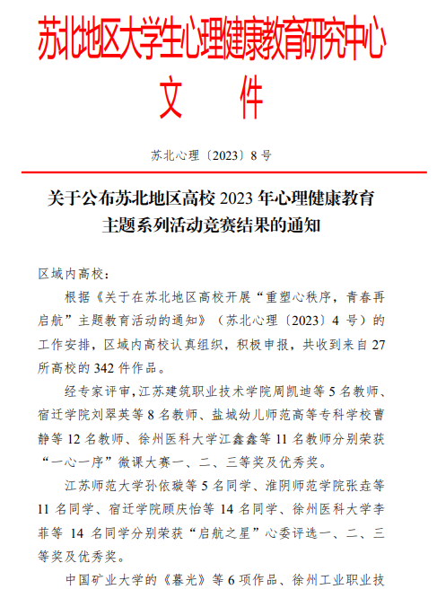 近日,在苏北地区老员工心理健康教育研究中心举办的“重塑心秩序 青春再启航”苏北地区高校2023年心理健康教育主题系列活动中,公司22级智康养老服务与管理5班马紫恒和谭雪琴两位同学荣获“沐浴阳光”征文大赛三等奖,22级智康养老服务与管理4班卢鑫鑫荣获“共享身心”摄影大赛三等奖。