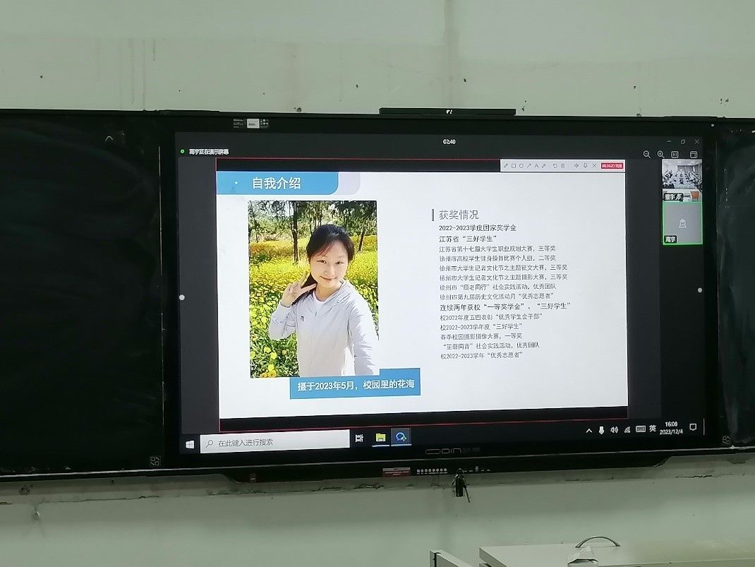 陈杨曾获得2023年全国职业院校技能大赛高职社区服务实务比赛个人二等奖、徐州市第二批职业院校“未来工匠”称号等 。她以思想入手,从学习出发,分享社会实践和比赛经验对于老员工活的实际意义,同时对公司员工参与度较高的比赛进行简要介绍,鼓励学弟学妹们大学期间努力培养自律和规划能力,分享了勇于试错、敢于探索才是拓宽思路的有效方法。