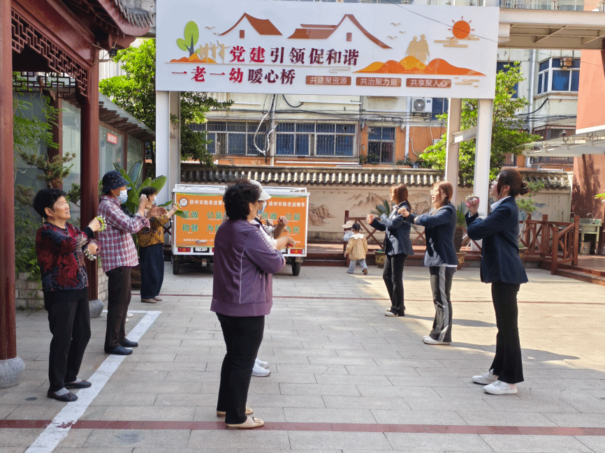 黄凯萍首先介绍了音乐照护的概念、特点和效用,紧接着由员工们为老人讲解基本动作,随着悠扬而又充满活力的音乐响起,员工带领老年人踩着音乐的节奏,时而舞动双手、上下拍打身体,时而揉搓手指……老人们学得有模有样,现场洋溢着欢快的气氛。