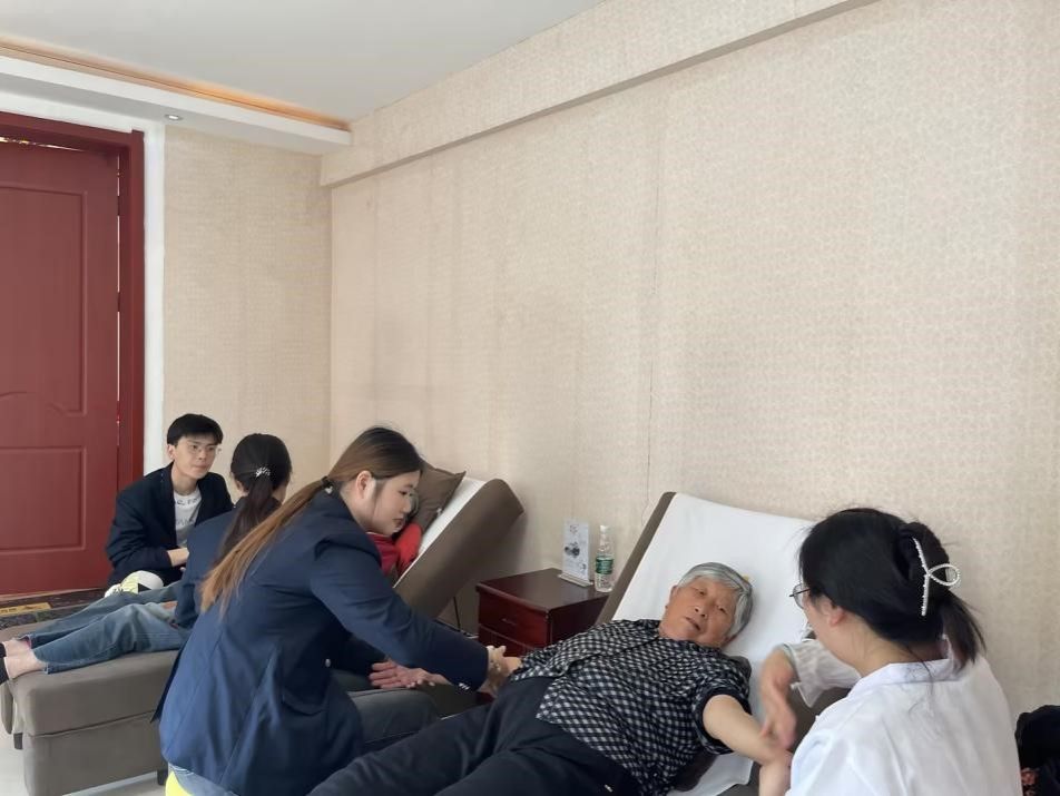另一边同学们将自己的课堂专业知识运用到了实践中,为老人介绍中医养生保健的理念与价值,他们根据老年人的身体情况及不同需求,为大家进行了穴位推拿与按摩。同时,普及常见的中医调理和预防保健养生的相关知识。活动得到老人们的一致好评。