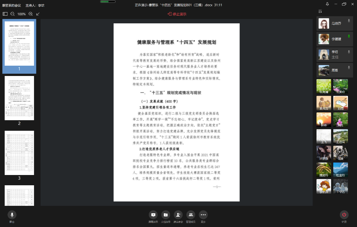会议上,李培主任首先从我系“十三五”规划完成情况与现状、“十四五”期间发展的指导思想与目标以及实现我系“十四五”发展目标的举措三部分介绍我系“十四五”规划的总体情况,紧接着全系教师在仔细研读规划后充分发表自己的意见。意见总体围绕以下三点:
