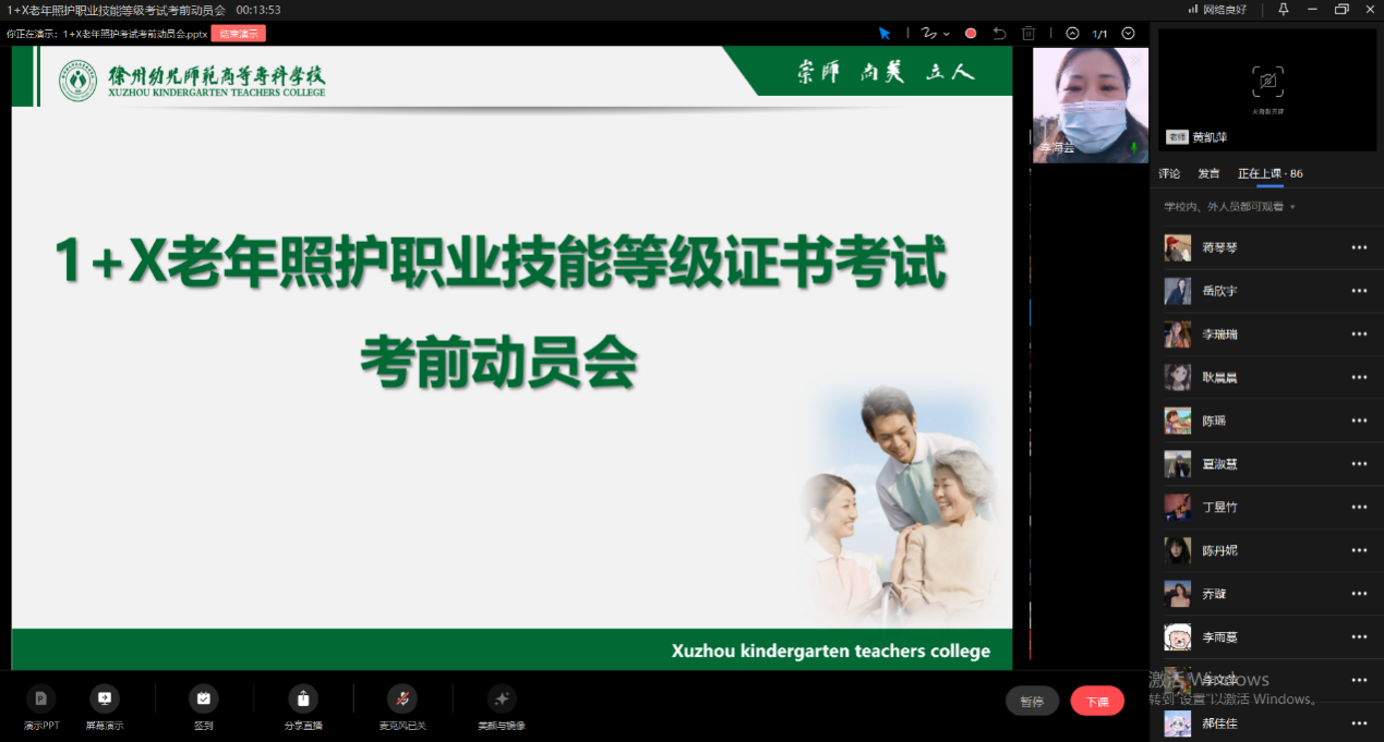 为鼓励员工认真备考“1+X”老年照护职业技能等级证书考试,12月1日,K1体育召开考前线上动员会。会议由公司经理李海芸主持,教学秘书黄凯萍和全体报考员工参会。