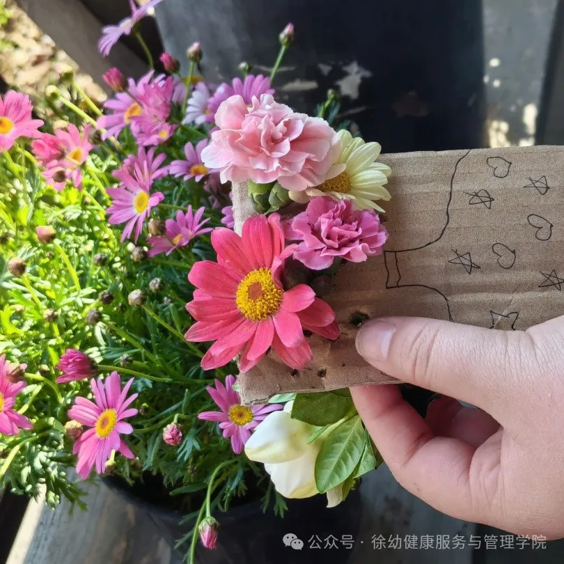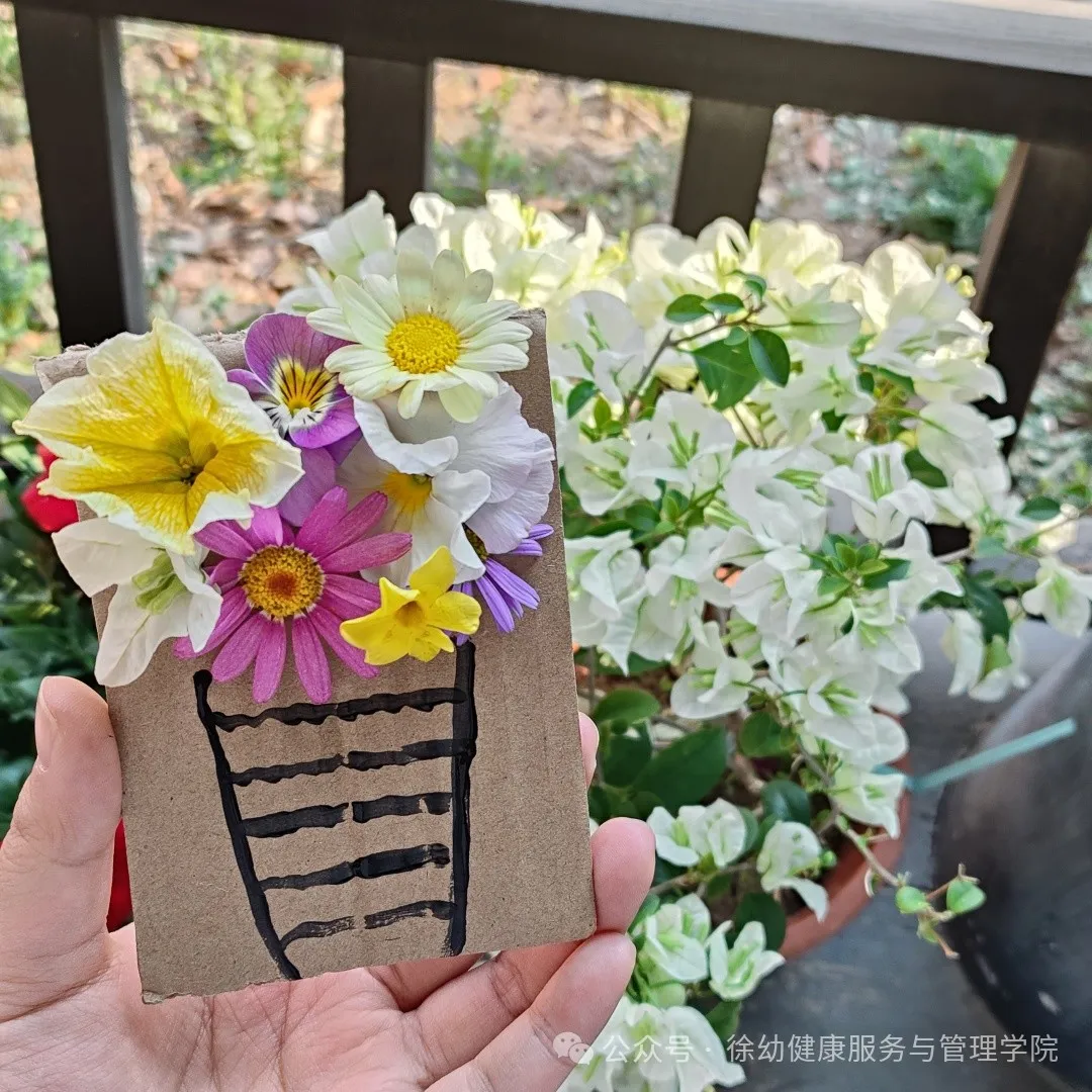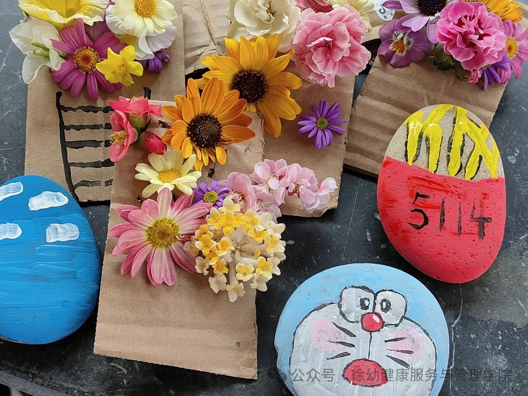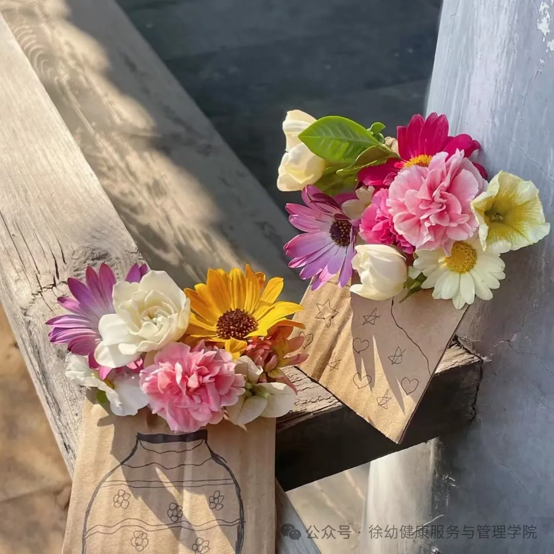 以纸板、花、黑色马克笔为主要材料,绘制插花载体,将花插在载体上,创作富有春日气息的立体花卉。通过制作“春意容器”,象征将美好与希望装入心中,释放负面情绪。